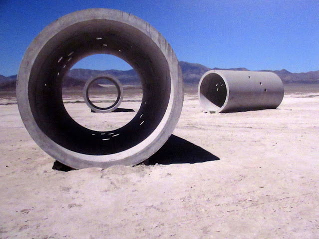 The concrete tunnels of Sun Tunnels are aligned to frame the sun as it rises and sets during the autumn and winter solstices: holes in the concrete cast projections of constellations of stars inside their surface. The installation echoes abandoned industrial landscapes.