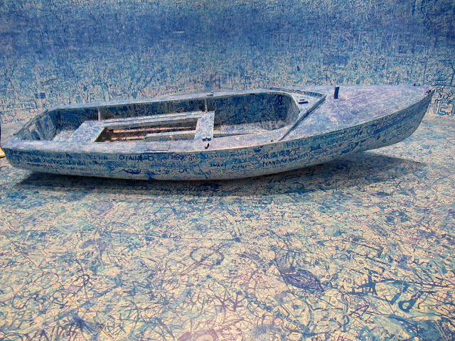 Add Colour (Refugee Boat) begins as an all-white boat in an all-white room. Ono's instruction for this collective, participatory work reads: 'Just blue like the ocean. You are invited to contribute your hopes and beliefs in blue and white'.
