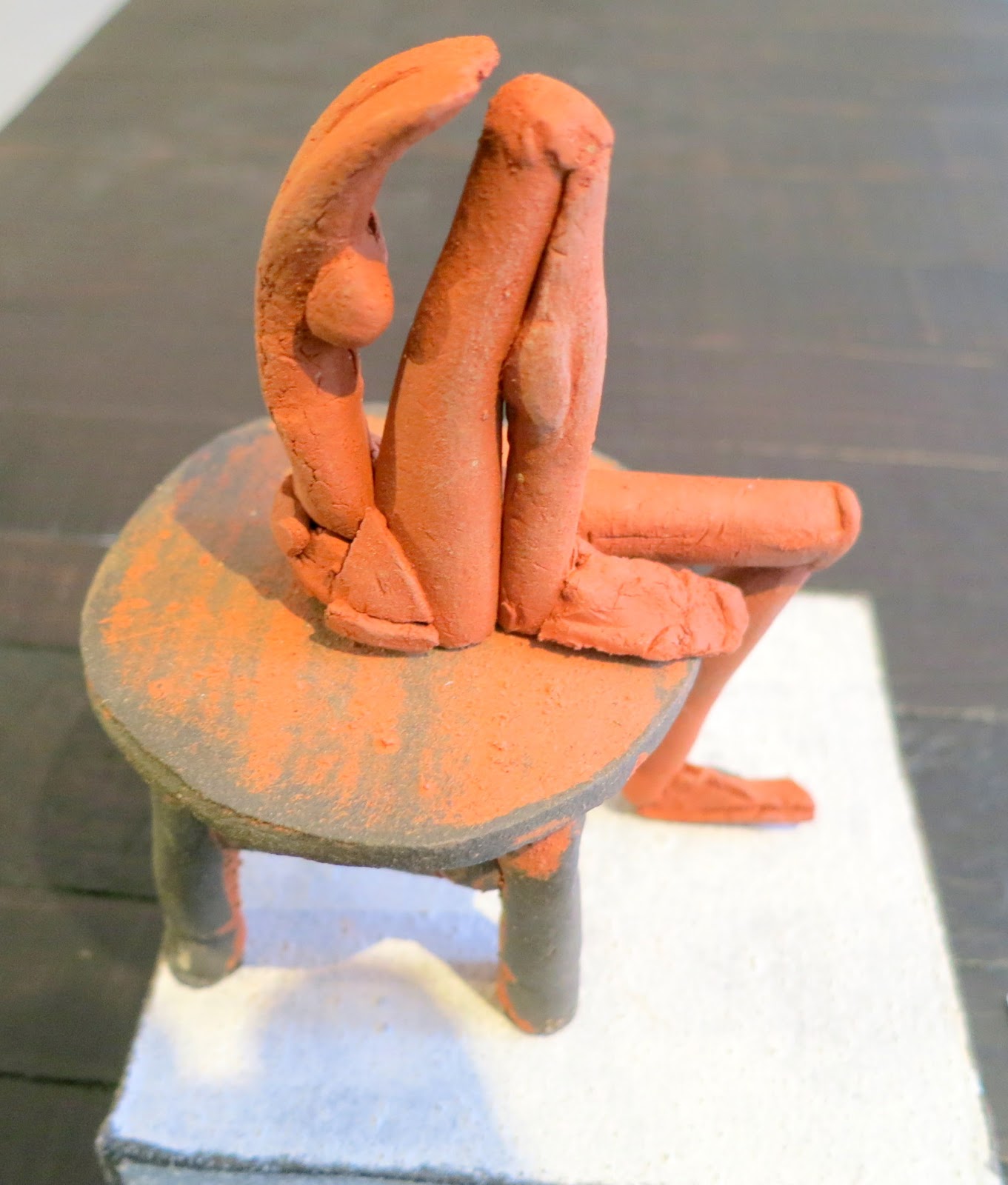Terracotta figure on stool, white base