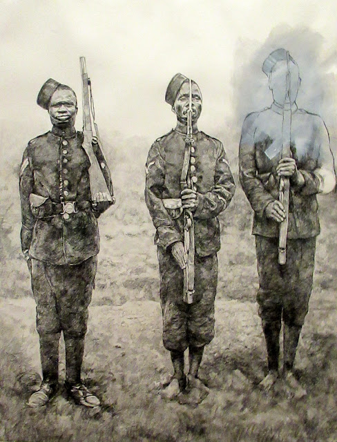 The extensive media reporting on the war in Afghanistan prompted Walker to consider the contributions of black soldiers to the British armed forces. Charly and Josiah are portraits of two contemporary soldiers. Each are delicately drawn over reproductions of recruitment posters from WWI that targeted the British colonies to address labour shortages in the British army. Walker's placement of the contemporary portrait over the document reveals the forgotten involvement of African and Caribbean military personnel across time.
